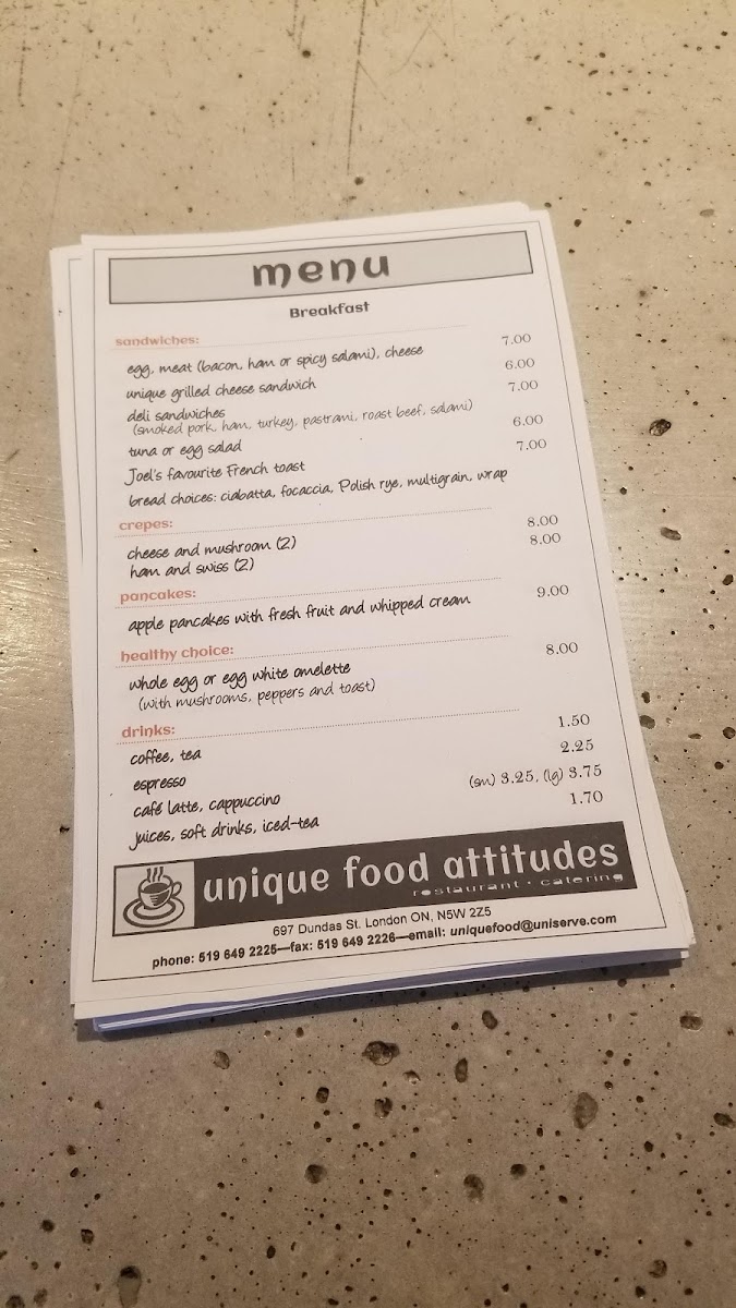 The menu invites you to indulge in options such as crepes filled with cheese and mushrooms and classic omelettes—all affordably priced around CA$10. Unique Food Attitudes also emphasizes dessert with exquisite offerings like Polish cheesecake and Triple Chocolate Brownies. Customers rave about the welcoming atmosphere and friendly service, where even dietary restrictions are thoughtfully accommodated.